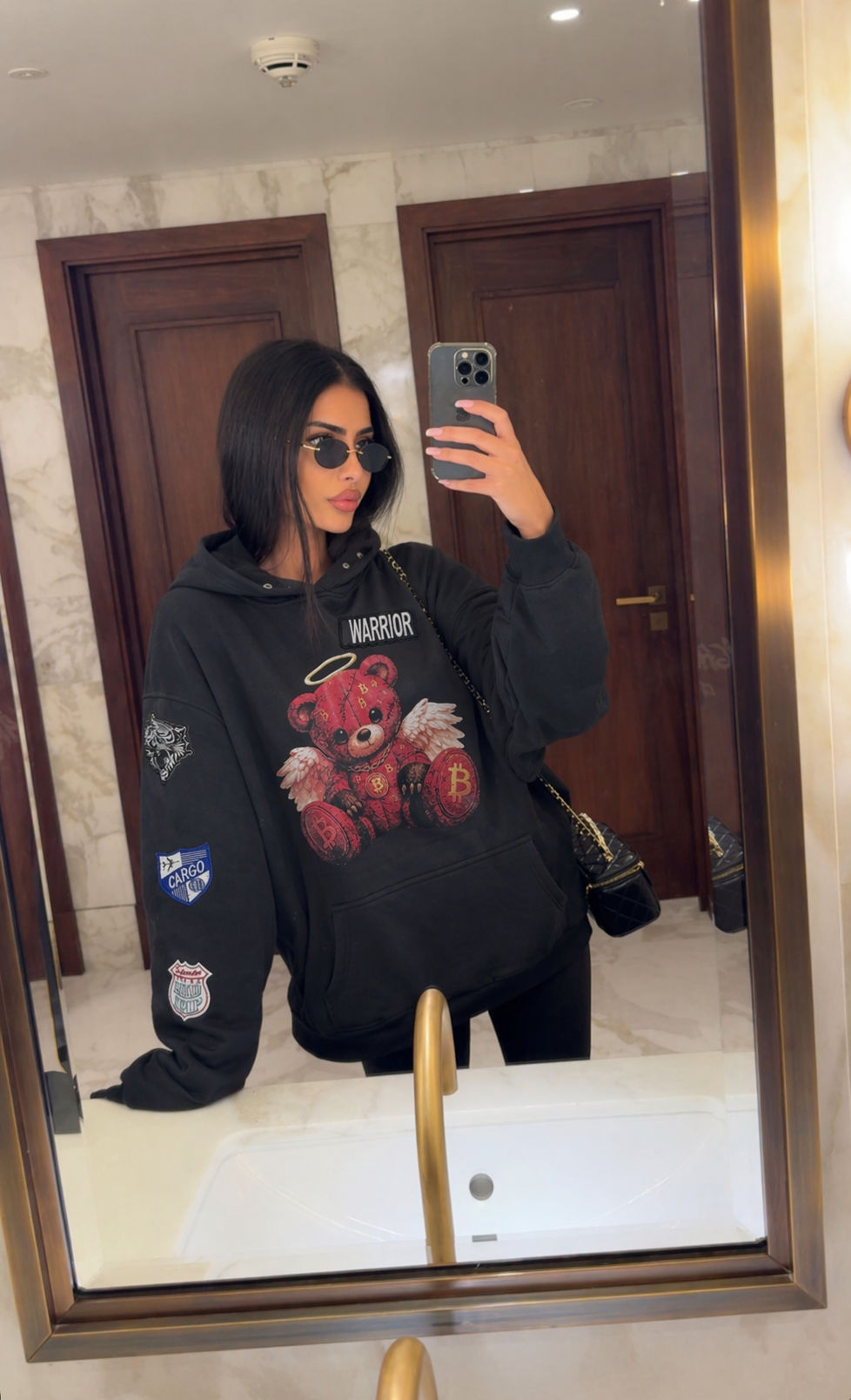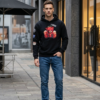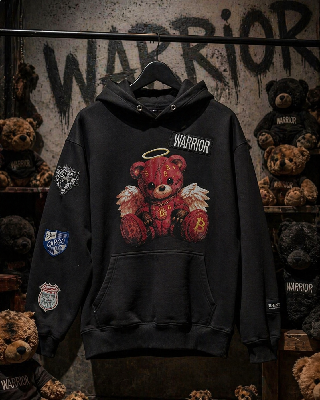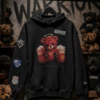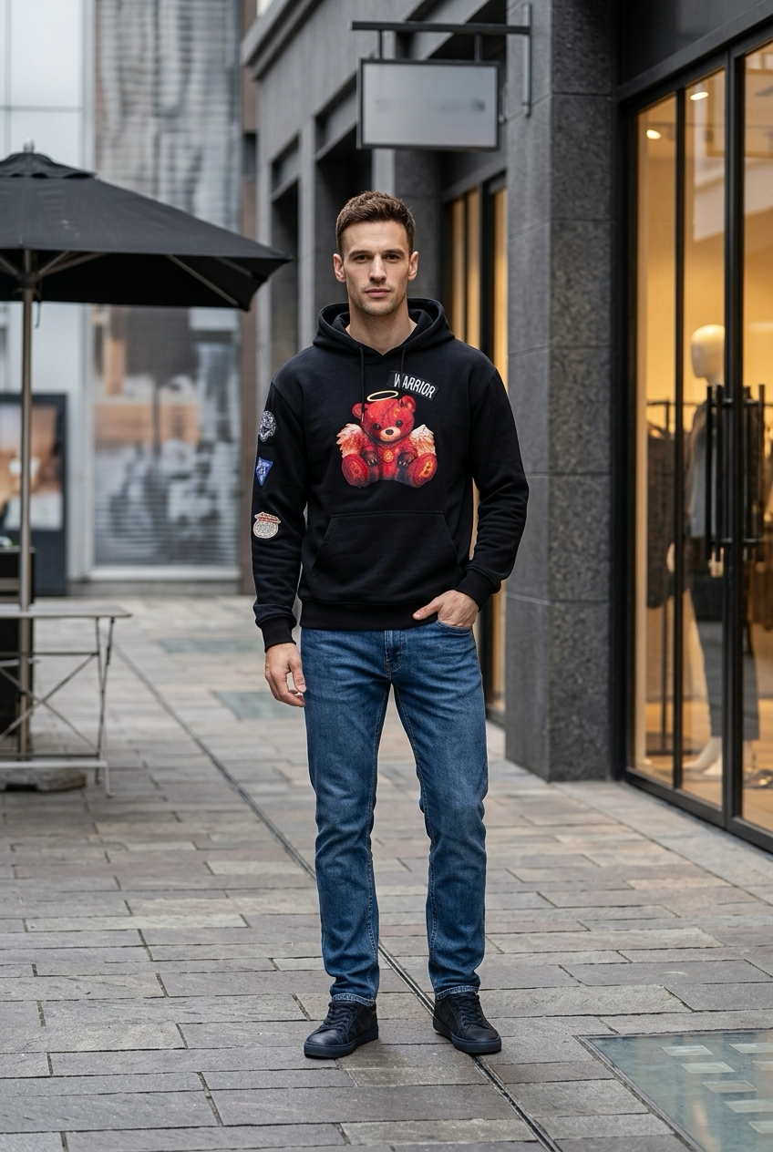 En sort oversized hoodie designet for å skille seg ut. Fronten preges av vår signatur: en teddy bamse i warrior stil med englevinger og halo en kontrast mellom rå street og ren attitude. På baksiden er det puff print når det miljøet ble etablert i 1990